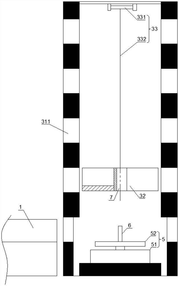 本实施例中,如图3和图4所示,传送升降驱动33包括卷扬机331和拉绳332,卷扬机331设于升降井31顶部、并通过拉绳332与升降台32连接。具体地,升降台32相邻设置放书格4的一侧滑设于升降井31的内侧壁上,起到导向作用,升降井31的底部空间大,为升降台32提供旋转换向空间。在卷扬机331的作用下,通过拉绳332带动升降台32升降,结构简单,成本低廉。