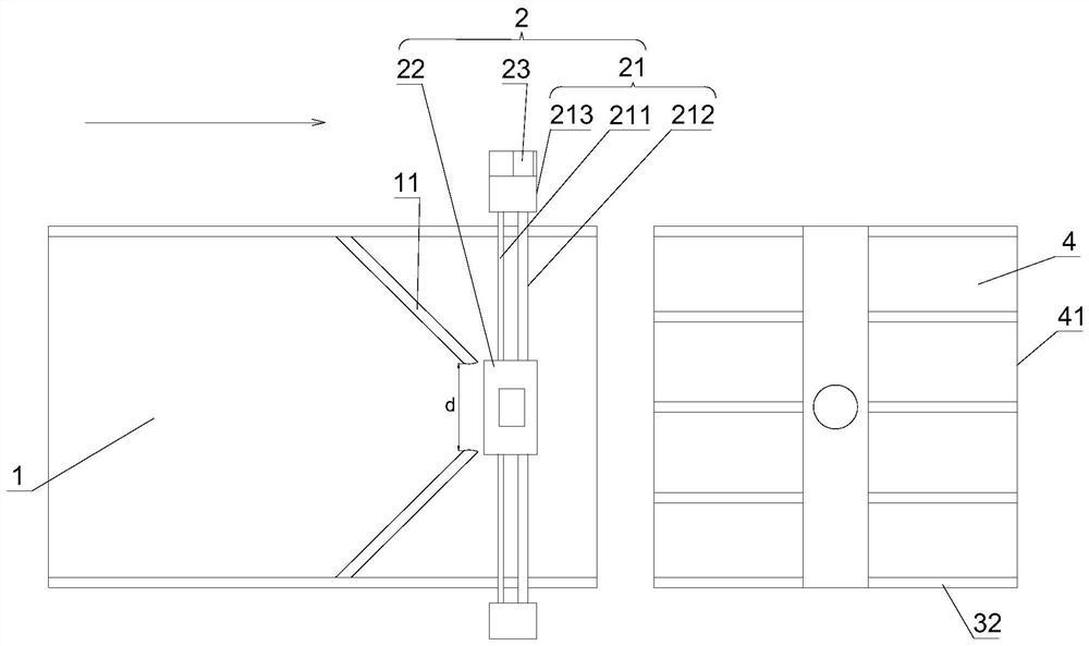 本实施例中,如图1和图2所示,横向导向架21包括横向导杆211、丝杆212和两个支撑座213,两个支撑座213分别位于输送带1的两侧,横向导杆211的两端分别固定在两个支撑座213上,分类拔动件22滑设于横向导杆211上,丝杆212的两端分别转动设置在两个支撑座213上,丝杆212穿设于分类拔动件22中并与分类拔动件22螺纹连接,丝杆212与分类驱动电机23连接。横向导杆211对分类拔动件22起到横向导向作用,分类驱动电机23能够驱动丝杆212旋转,丝杆212再带动分类拔动件22沿横向导杆211移动,达到横向推图书的效果,从而实现图书的分类,分类驱动电机23为双向电机,使分类拔动件22能够沿横向导杆211前后移动,从而使得图书能够沿垂直于输送带1的方向移动分类,以对准相应类别的放书格4。