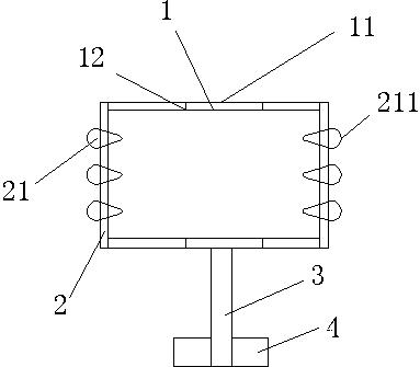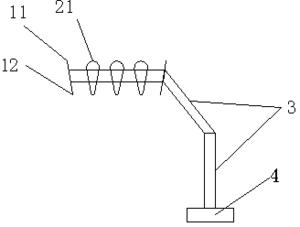 参考图1、2,一种带摇臂支架的塑料袋支撑架,包括不锈钢粗钢丝制作的环绕一周的护栏1,其所述护栏1为上下2根平行的钢丝11和钢丝12组成;所述护栏上还设置有若干组挂钩21,所述挂钩21由上端的挂耳211和下端钢丝环绕组成;在所述没有设置挂钩21的一面护栏1上安装有一个摇臂支架3,所述摇臂支架底端安装有一个固定夹4,用来和床体固定。摇臂支架3分为上下两节,每一节为一个四连杆机构。所述摇臂支架3上安装有弹簧。