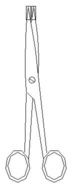 本实用新型的利器保护套在之前使用的保护套基础上改进,将材料换成卡纸,制作成的一个长方形,中间有两个小圆孔,上端为反折部分,下端是一个矩形缺口,两个小圆孔间的距离,既考虑轴节器械不完全锁闭的灭菌要求,又要使被固定后剪刀整体宽度不超出10cm,这样工作人员就能很容易地将剪刀放入固定的医用纸塑袋内。