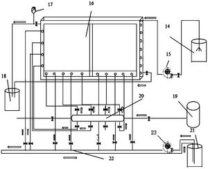 如图1、2、3所示,本实用新型的一种模拟压裂液返排控制支撑剂回流的实验装置,包括搅拌罐14、螺杆泵15、可视化铺砂装置16、废液罐18、氮气瓶19、气源分配器20、压裂液搅拌罐21、压裂液管22、压裂泵23;所述搅拌罐14、螺杆泵15、可视化铺砂装置16、废液罐18依次通过管线连接,所述可视化铺砂装置16、废液罐18之间设有流量计17,该部分为支撑剂铺置部分;所述氮气瓶19、气源分配器20、可视化铺砂装置16依次通过管线连接,该部分为模拟气体裂缝滤失部分,所述压裂液搅拌罐21、压裂泵23、压裂液管22依次连接,所述压裂液管22上设有出液口,所述出液口与可视化铺砂装置16通过管线连接,该部分为模拟液体裂缝滤失部分。本实用新型考虑了压裂液返排,设计了气源分配器、压裂液循环系统、液体(压裂液、地层水)滤失系统、气体滤失系统,通过调节氮气瓶19的开度大小来控制气压,使用气源分配器20及其管线系统来模拟地层气体滤失时的状态,通过液体循环系统注入管线来模拟压裂液返排及地层流体滤失状况,从而实现更加与现场实际施工相匹配,通过本实用新型一种考虑压裂液返排的可视化支撑剂动态铺置控砂装置得到的支撑剂铺砂实验数据对现场施工及油气增产改造效果评价具有重要的参照价值。