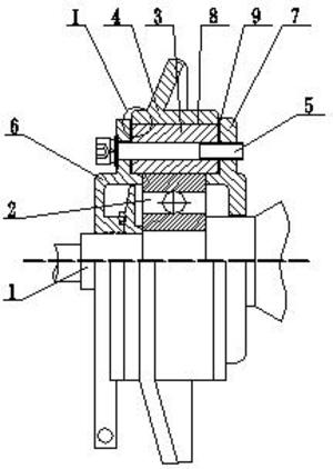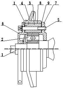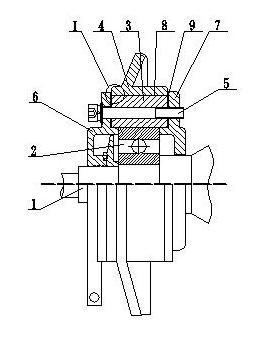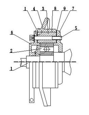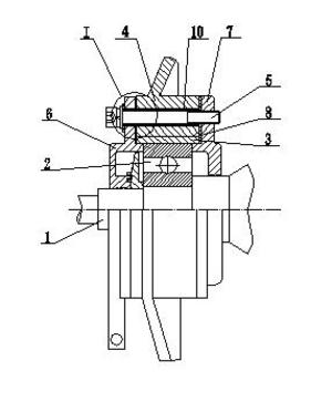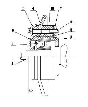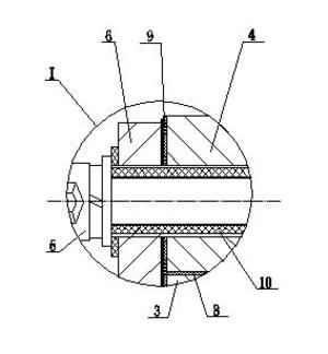图中:1、电机转轴,2、轴承,3、内轴套,4、端盖,5、螺栓,6、外轴承盖,7、内轴承盖,8、绝缘套,9、绝缘环,10、绝缘管。