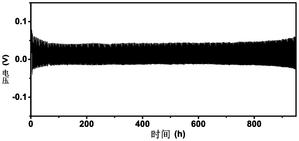 本发明制备的薄膜材料中的1,2-二甲基咪唑配体能够与锂离子形成特定键合作用,对锂在电极表面沉积产生重要影响作用;薄膜材料的表面附有大量的钴与1,2-二甲基咪唑配合物颗粒,这些配合物颗粒具有微孔,能够为锂离子的存储或寄居提供一定的空间,配合物颗粒较高的比表面能也对离子具有一定吸附作用,从而对离子的沉积以及锂枝晶的生长产生重要影响;在0.5mA cm-2情况下,循环950h,电池电压保持平稳(图3),锂在电极上沉积均匀,锂枝晶生长得到抑制。