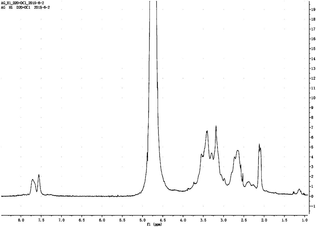 所述第四种溶液的加入量应使第四种溶液中的巯基与第三种溶液中的碳碳双键的摩尔比为1.3:1,所述二甲基苯基磷与第四种溶液中的巯基的摩尔比为0.000005:1;所制备的带保护基团的多肽修饰的聚酰胺-胺型树枝状聚合物的核磁氢谱如图3所示,图3中化学位移7.5~7.8ppm处的峰说明引入了多肽上面的Fmoc基团。
