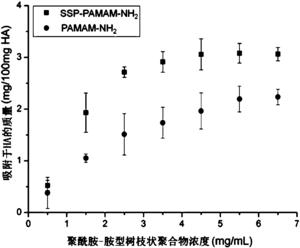 将实施例1制备的SSP-PAMAM-NH2溶解在去离子水中,配制7个浓度梯度的SSP-PAMAM-NH2水溶液(0.5mg/mL、1.5mg/mL、2.5mg/mL、3.5mg/mL、4.5mg/mL、5.5mg/mL及6.5mg/mL)。取量程为4mL的离心PE管21支,分别向其中加入100mg羟基磷灰石粉末,然后取浓度分别为0.5mg/mL、1.5mg/mL、2.5mg/mL、3.5mg/mL、4.5mg/mL、5.5mg/mL及6.5mg/mL的SSP-PAMAM-NH2水溶液各1mL加入各离心PE管中(每个浓度梯度的SSP-PAMAM-NH2水溶液设置3支离心PE管),在37℃振荡搅拌12h,然后对各离心PE管中的混合液离心(10000转/分钟,3分钟),分别取离心所得上清液,用紫外分光光度计测量上清液中的SSP-PAMAM-NH2的吸光度值,对照标准曲线,即可计算出吸附在羟基磷灰石粉末上的SSP-PAMAM-NH2的量,结果如图5所示。检测结果表明,SSP-PAMAM-NH2在羟基磷灰石粉末(100mg)上的饱和吸附值为3.1mg。