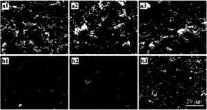 图8是实施例7中各实验组羟基磷灰石片表面形成细菌生物膜情况的扫描电镜照片(a组为金黄色葡萄球菌,b组为大肠杆菌,a1、b1为阳性对照组,a2、b2为实验组1,a3、b3为实验组2);