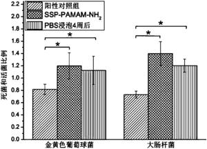 选取金黄色葡萄球菌ATCC25923和大肠杆菌ATCC25922为检测细菌,用含0.2%葡萄糖的MHB培养基过夜培养备用。在24孔板中放入各实验组羟基磷灰石片,每组羟基磷灰石片各3块。每孔加入1.8mL含0.2%葡萄糖的MHB培养基,接种200μl菌液,用加样枪轻吹打混匀后37℃需氧培养24小时后,于羟基磷灰石片表面形成生物膜。然后在超净台内用PBS漂洗24小时生物膜以去除浮游细菌,然后将培养有生物膜的羟基磷灰石片转移至含有2mLPBS的离心管中,超声震荡以剥离羟基磷灰石片上的生物膜,用连续稀释方法在MHB琼脂平板上培养,进行细菌菌落计数。结果如图10所示,经4周PBS缓冲后,吸附了SSP-PAMAM-NH2水溶液的羟基磷灰石片的活细菌数与吸附了SSP-PAMAM-NH2水溶液的羟基磷灰石片的即刻抗菌效果无统计学差异,明显少于阳性对照组,说明吸附有SSP-PAMAM-NH2的羟基磷灰石片具有长效的抗菌效果。