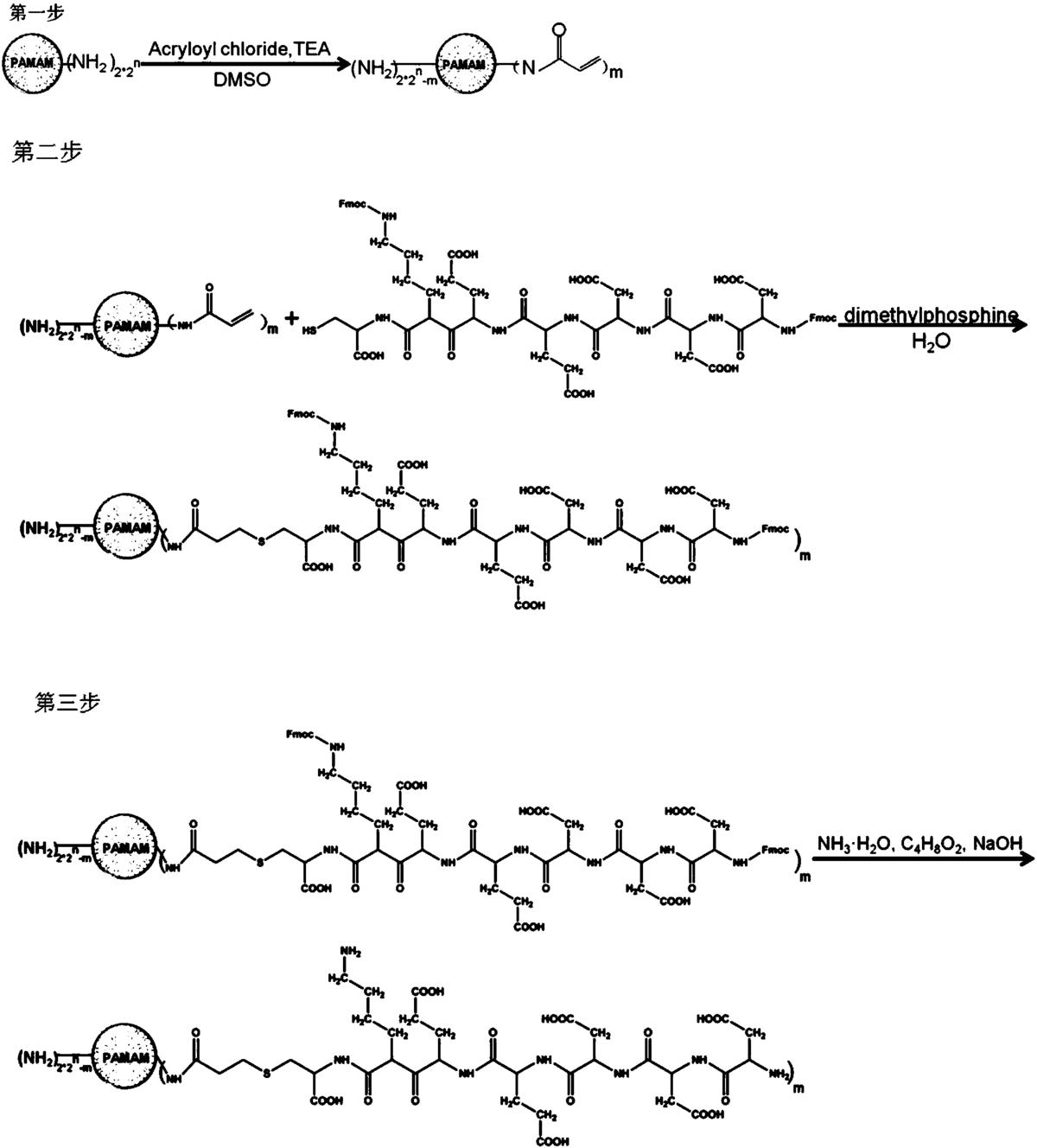 所述结构式中,n是端基为氨基的聚酰胺-胺型树枝状聚合物的代数,n=4、5、6,m是接枝多肽数目,m=3~4。