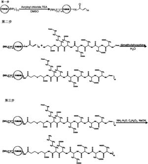 在氩气保护下于-5~5℃将丙烯酰氯加入到第二种溶液中搅拌反应至少24h,反应结束 后经透析、过滤、冷冻干燥,得到端基为丙烯酰基的聚酰胺-胺型树枝状聚合物;所述丙烯酰 氯与第二种溶液中的端基为氨基的聚酰胺-胺型树枝状聚合物的摩尔比为(3~4):1;