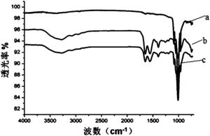 图7是实施例6空白组羟基磷灰石片(a)、SSP-PAMAM-NH2吸附后羟基磷灰石片(b)及SSP-PAMAM-NH2吸附后用PBS冲洗后羟基磷灰石片(c)的红外光谱图;