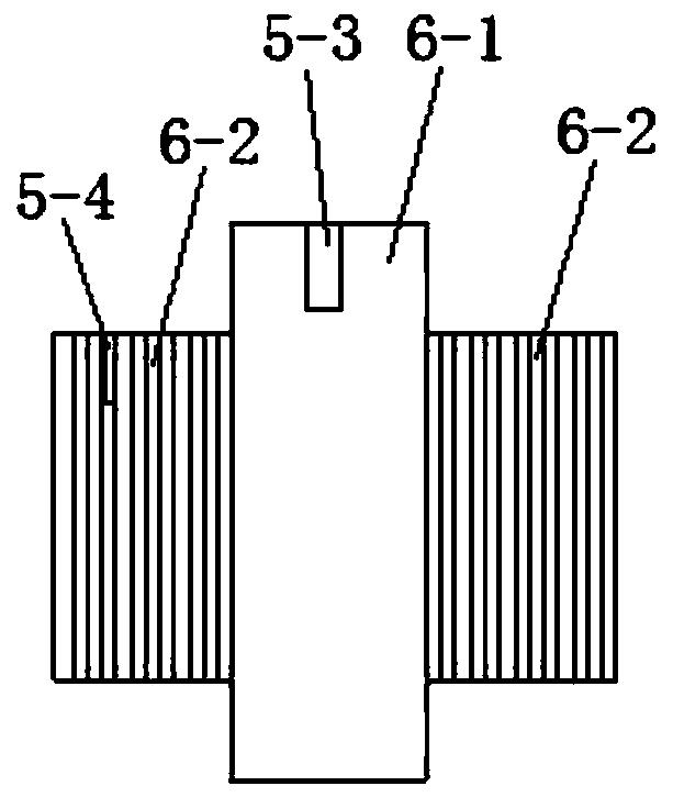 节点管1上焊接固定有固定支管3,连接支管4和固定支管3的端部分别固设有等管焊接件9,且连接支管4和固定支管3的端部的两等管焊接件9之间通过平头连接件6螺纹连接,平头连接件6包括柱形中间段6-1和位于柱形中间段6-1两侧的外螺纹段二6-2,且柱形中间段6-1的周向上也设置有销孔5-3,如图3所示,当然,外螺纹段二6-2也可选择实心型或空心型。柱形中间段6-1的直径与连接支管4、固定支管3的直径相同,且柱形中间段6-1的周向上也设置有径向的销孔5-3,便于将转动销10插入销孔5-3内以拧紧连接支管4和固定支管3。外螺纹段二6-2上也设置有径向的定位孔5-4,等管焊接件9上设置有与该定位孔5-4位置相应的通孔7-1,等管焊接件9和外螺纹段二6-2之间通过插设于该处定位孔5-4和通孔7-1内的限位销(图中未示出)实现限位。