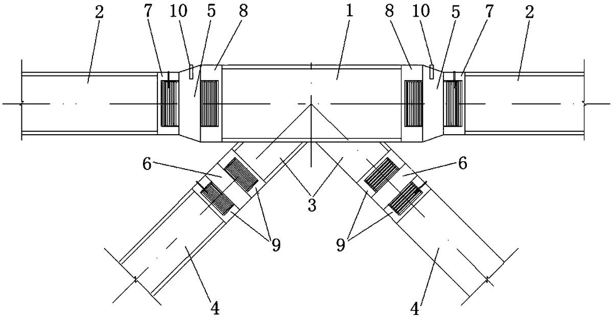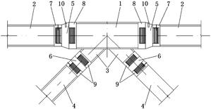 在本实施例中,在工厂内,小头焊接件7、大头焊接件8以及等管焊接件9与各管件之间采用对接焊缝连接;固定支管3的相贯坡口采用多维数控切割,节点管1和固定支管3直接采用自动数控对接坡口焊。焊接后,在接缝处进行涂装处理,以保证结构使用的耐久性。小头焊接件7、大头焊接件8以及等管焊接件9的端面所设置的与连接件的螺纹段相配合的螺纹孔为盲孔,则各段管件之间形成封闭空间,提高了结构使用的耐久性。