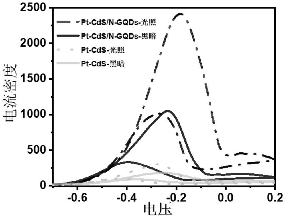 称取2mg所制备的Pt-CdS-氮掺杂石墨烯量子点复合材料,添加到0.5mL的乙醇,0.5mL的蒸馏水以及20μL的全氟磺酸的混合溶液(5wt%)中,超声1h形成均匀分散液,然后将上述分散液涂渍在预抛光的玻碳电极(L-GCE)表面,干燥后,得到表面附有Pt-CdS-氮掺杂石墨烯量子点复合材料的电极,即为Pt-CdS-氮掺杂石墨烯量子点复合材料电极,简写为Pt-CdS/N-GQDs电极;用上述同样方法制得Pt-CdS电极;