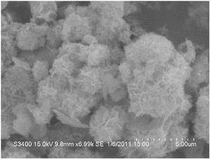 产物的SEM照片见图8,粉末的SEM照片显示粒子为花球形,比表面积大,粒径为1~2.5μm,粒径较实施例4进一步减小,说明随着水热反应时间的延长,粒径在逐渐减小。