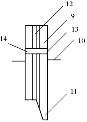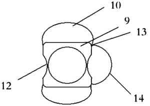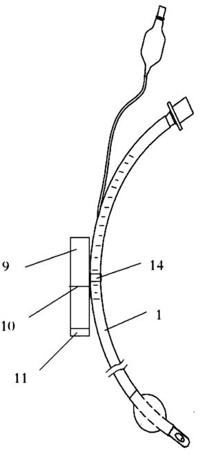 所述牙垫包括一具有中空管的牙垫本体9,设在牙垫本体中部前、后外壁上与中空管轴向垂直的齿前挡板10,还有设在牙垫前端后壁向前伸出的压舌板11;牙垫本体左右两侧的外壁做成内凹的圆弧形壁面12,以利用气管插管的固定;在牙垫本体的一侧设有由弹性材料制作而成的,可弯折,且能将牙垫扣合固定在气管插管的管体外壁上的扣合装置;