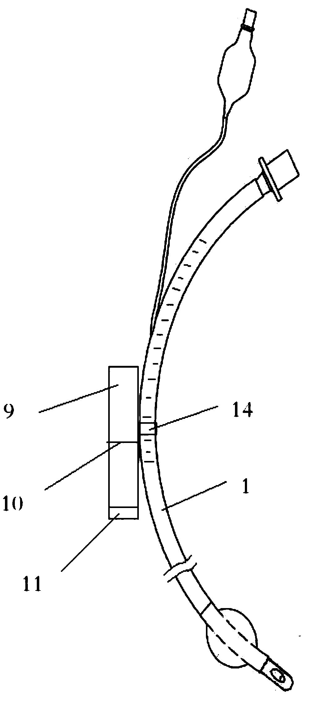 所述气管插管包括管体,管体后端是氧气接口,管体前端是可插入病人气管内的插入口,管体外壁上设有可指示气管插管插入深度的刻度线;气管插管的管体外壁上刻度线20-26cm处的位置设计成磨砂面,或设置可增大表面摩擦力的凸起或凹陷的纹路;