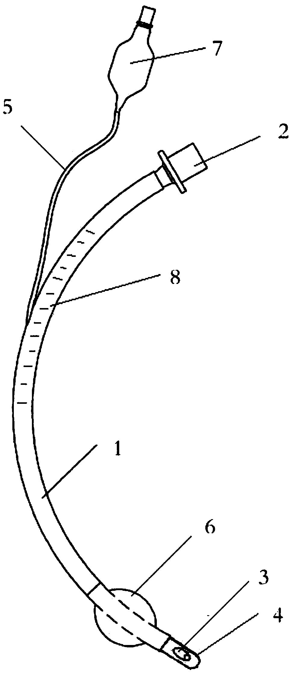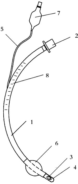 所述气管插管包括管体1,管体后端是氧气接口2,管体前端是设有墨菲孔3的插入口4,管体外壁上设有可指示气管插管插入深度的刻度线8;管体一侧设有粘附在管体外壁上的充气管5,管体前部设有套在管体外壁上的气囊6,充气管的后端充气口上设充气阀7,充气管的前端与气囊连通;气管插管的管体外壁上刻度线20-26cm处的位置设计成磨砂面;
