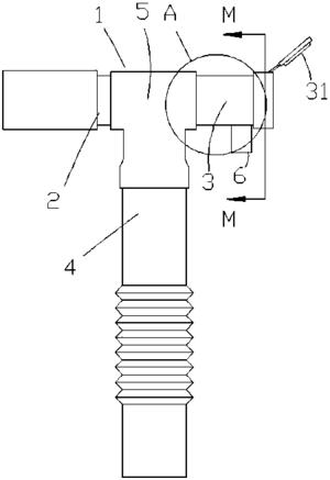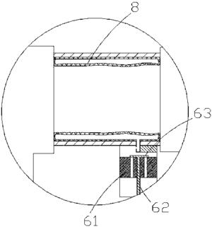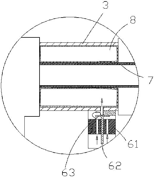 其中的附图标记为:调节装置主体1、第一管道2、第二管道3、封盖31、第三管道4、柔质三通管5、充气阀6、阀座61、阀芯62、阀片63、纤支镜麻醉管7、气囊8。