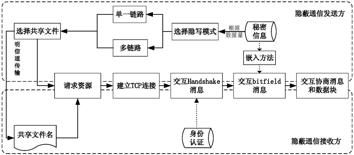进一步,所述步骤S2,通过明信道传递共享文件的关键信息的方法包括:隐蔽通信发送方通过明信道向隐蔽通信接收方传递共享文件的关键信息。进一步,所述步骤S3,通过相应Peer节点建立TCP链接的方法包括: