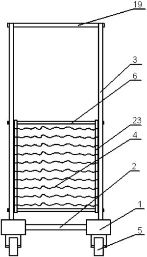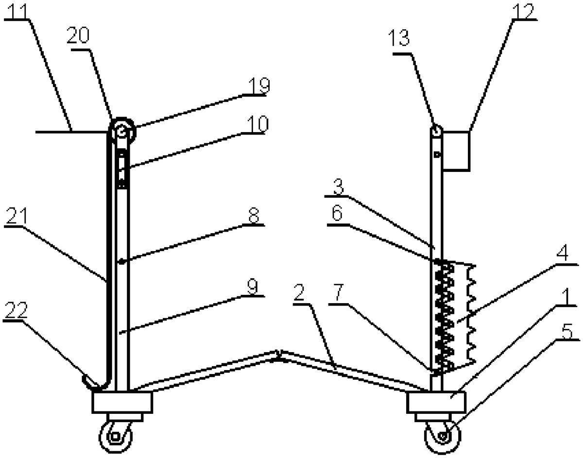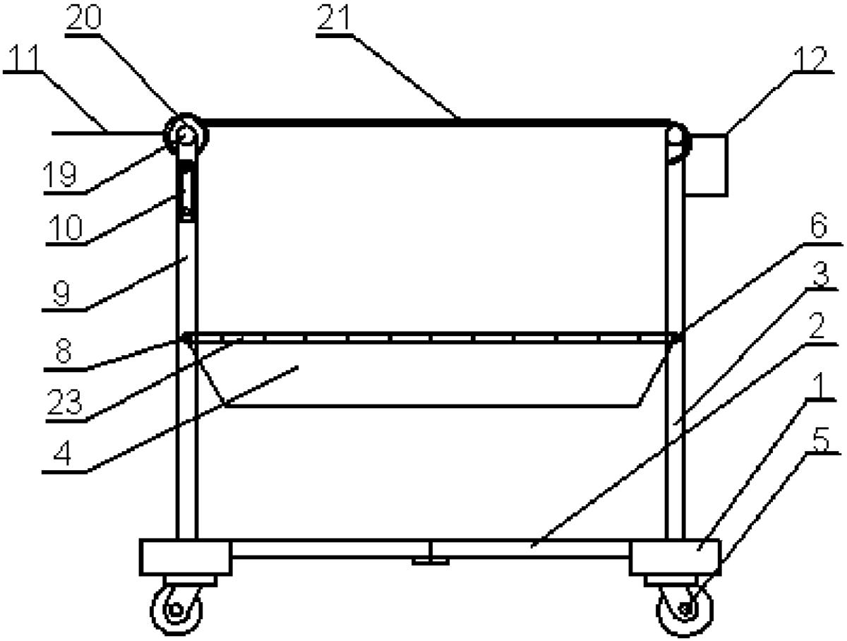 1.一种折叠式临床护理推车,包括移动小车和清洗装置,所述移动小车包括底座(1)、 折叠底板(2)、右侧支柱(3)、左侧支柱(9)、储物篮(4)、操作桌面(21)和万向轮(5);其特征 在于:所述底座(1)设置为四个,每个底座(1)下部安装有一个万向轮(5),其中两个底座(1) 上安装有右侧支柱(3),2个右侧支柱(3)之间设置有连接彼此顶端部的安装杆(13),另两个 底座(1)上安装有左侧支柱(9),安装右侧支柱(3)的两个底座(1)之间、安装左侧支柱(9)的 两个底座(1)之间均设置有横杆,两个横杆之间安装有折叠底板(2);所述左侧支柱(9)的中 部设置安装轴固定孔(8),顶部设置安装杆(19),安装杆(19)上转动安装有转轴(20),转轴 (20)与操作桌面(21)的一侧边连接,操作桌面(21)的另一侧边设置弧形部(22),操作桌面 (21)绕安装杆(19)转动至水平位置,其弧形部(22)扣入右侧支柱(3)顶端的安装杆;所述右 侧支柱(3)下部设置凹槽(7),中部设置安装轴固定孔(8),储物篮(4)的一侧的安装轴插入 安装轴固定孔(8),另一侧的安装轴滑入凹槽(7)内固定,所述储物篮(4)包括布袋和折叠上 边沿(23),布袋的开口处与折叠上边沿(23)以及两个安装轴围成的框架缝合在一起;其中 一个右侧安装杆(13)的上部安装有手快速消毒液固定支架(12),左侧安装杆(19)的上部安 装有利器盒固定支架(11)。
