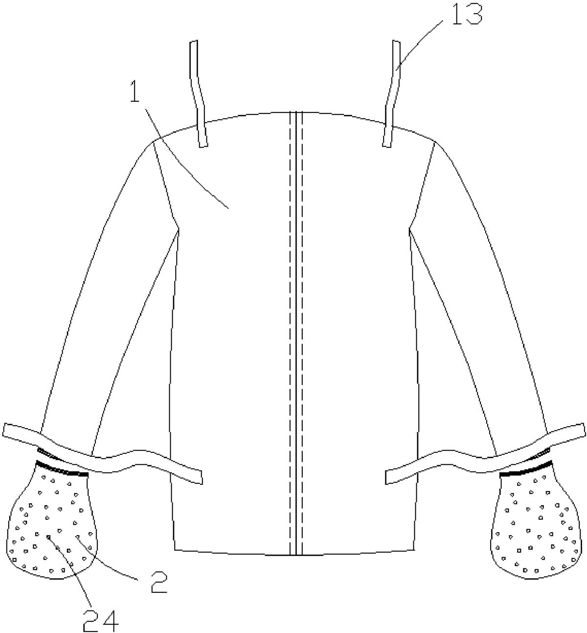 1.医用防拔管反穿约束服,包括约束服本体(1),其特征是:所述的约束服本体(1)的袖口处连接有约束手套(2),所述的约束手套(2)与约束服本体(1)可拆卸式固定连接,所述的约束手套(2)的上部设置有手套约束扣(21),所述的约束服本体(1)的胸口位置设置有胸部固定带(11),所述的手套约束扣(21)能与胸部固定带(11)固定连接,将约束手套(2)固定于约束服本体(1)的胸口处或两侧床栏上,所述的约束手套(2)的内侧底面填充有垫层(22),约束手套(2)的上部开设有可开合的观察窗(23),所述的约束手套(2)上还设置有数个只能容纳一根手指穿过的指孔(25)。