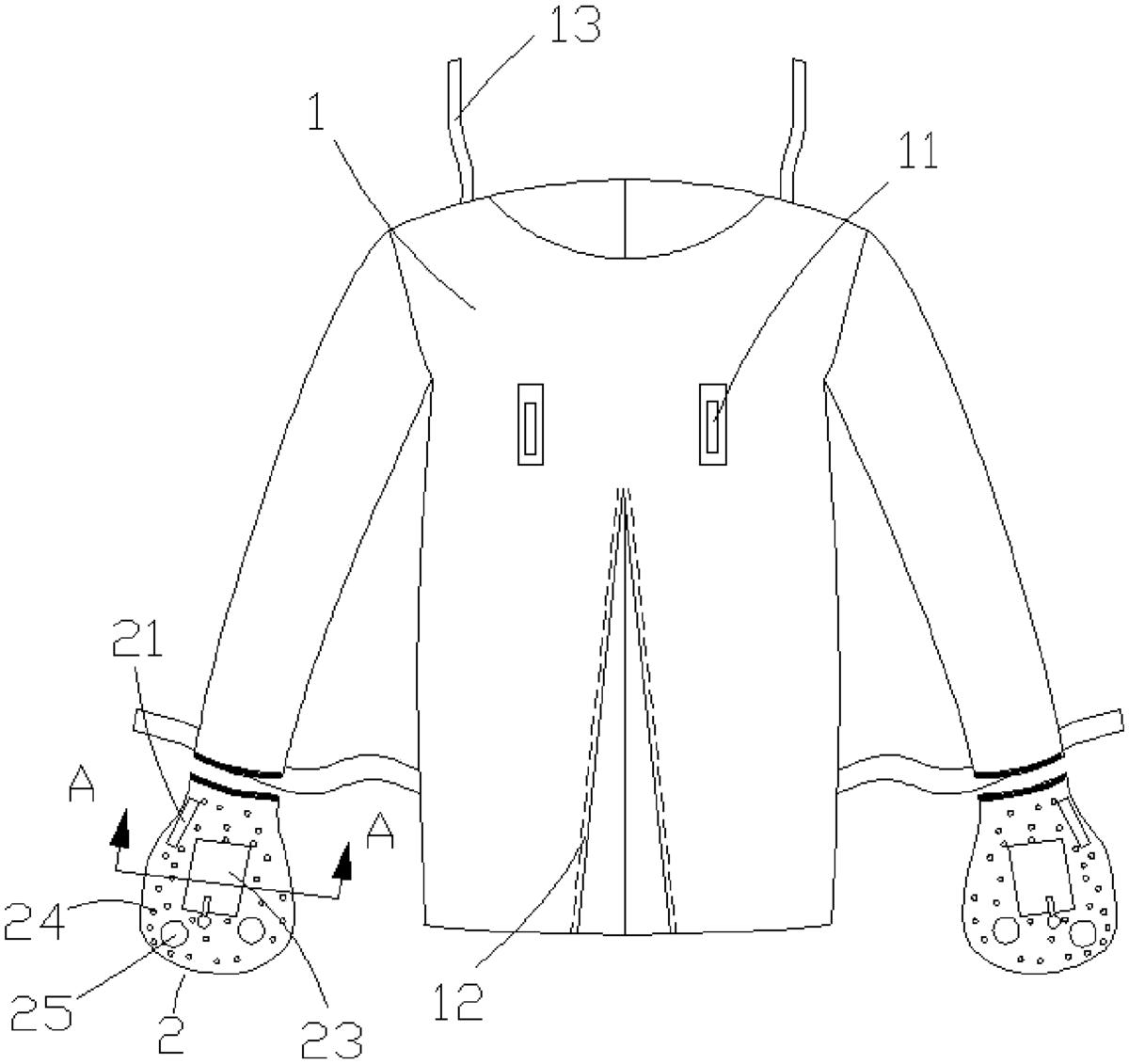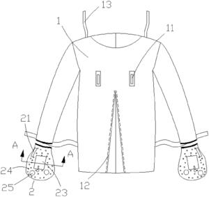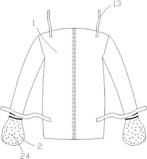 其中的附图标记为:约束服本体1、胸部固定带11、叉状开口12、束带13、约束手套2、手套约束扣21、垫层22、观察窗23、微孔24、指孔25。