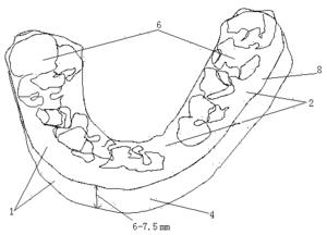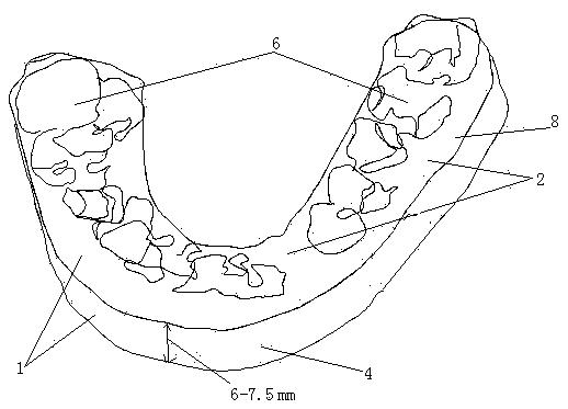 导板上下两颌面,分别记录了上下颌牙列复位后的牙齿阴模,咬合导板的厚度、上颌颊侧和下颌舌侧凹陷边缘距导板边缘距离,每个患者的情况有所不同,一般厚度7.5mm-8.0mm,外边缘厚度1.0-1.5mm,整个导板为上下颌牙列对位后的咬合记录。