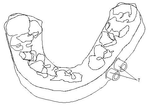 支架连接杆凹槽用于与其他部位的复位导板连接,起辅助固定的作用。可为圆柱形,直径大小与导板唇侧厚度差不多,稍小或一致。支架连接杆凹槽位于导板4-5牙位,支架连接杆凹槽1-2个。